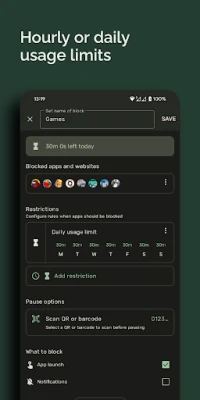 Wasting time on social media, or watching too many YouTube videos? You can configure an hourly/daily usage limit for specific apps. When you reach the time limit, the apps will be blocked for the remainder of the day. The limits are customizable per day of the week. For example, detox from Facebook and other social media apps by only allowing 30 minutes per weekday, limit Reddit to 20 minutes in the weekend, or block Whatsapp after 1 hour of messaging.