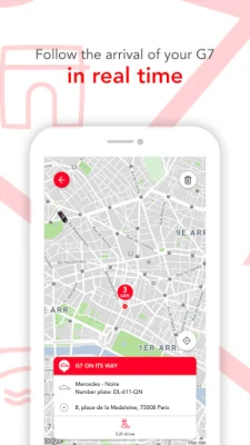 - Launch the app, you are geolocated, indicate the number of passengers tbenefit from the most adapted service, tap on "now" tbook a G7 where you are, or "later" for a request up t30 days in advance